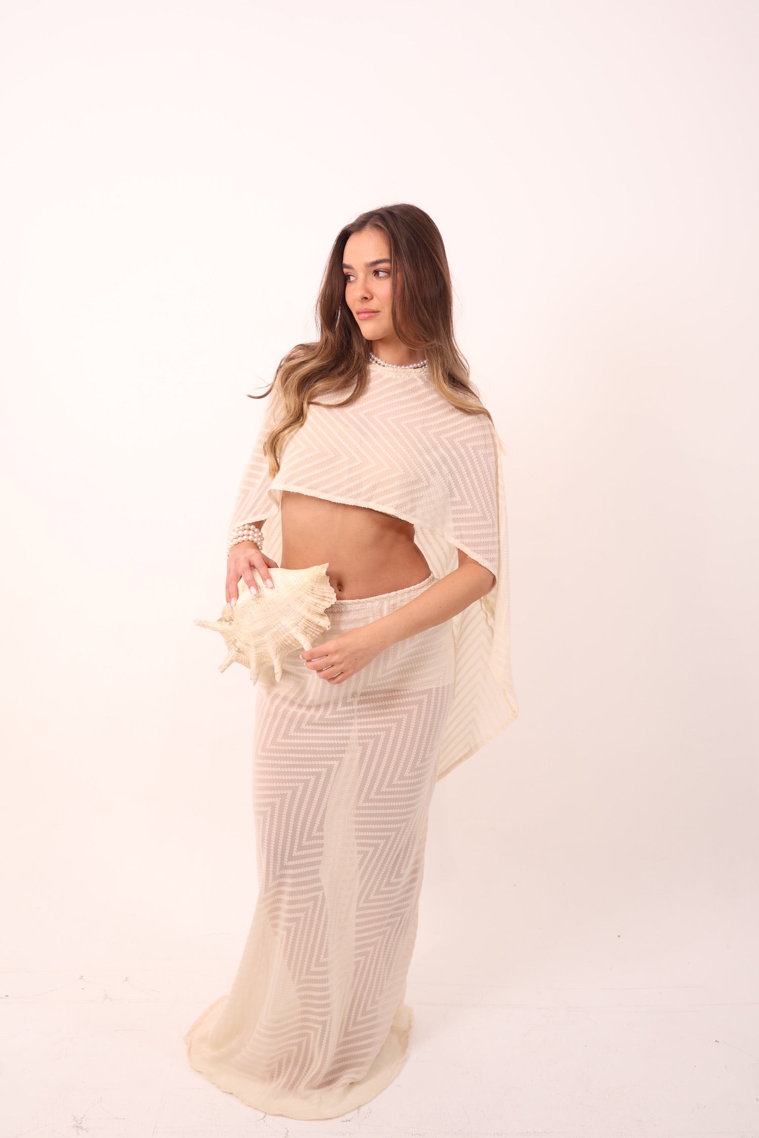 סט CORAL הוא הצהרה אופנתית שמטשטשת את הגבול בין בגדי חוף לבגדי ערב יוקרתיים. עם בד שיפון עשיר בטקסטורת זיגזג וגוון שמנת נקי, מדובר בסט שעוטף אותך בתנועה בלתי פוסקת של סטייל.
